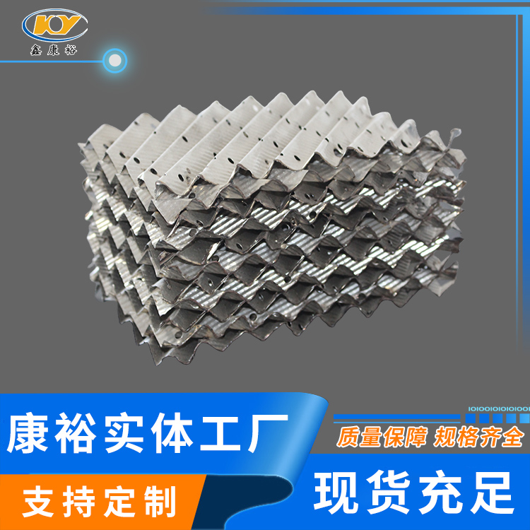 金屬孔板波紋填料(即金屬規(guī)整波紋填料、不銹鋼孔板波紋填料或稱金屬波紋填料)是在金屬薄板孔面打孔、軋制小紋、大波紋后組裝而成,具有阻力小,氣液分布均勻,效率高,通量大,放大效應(yīng)不明顯等特點(diǎn),應(yīng)用于負(fù)壓常壓和加壓操作。