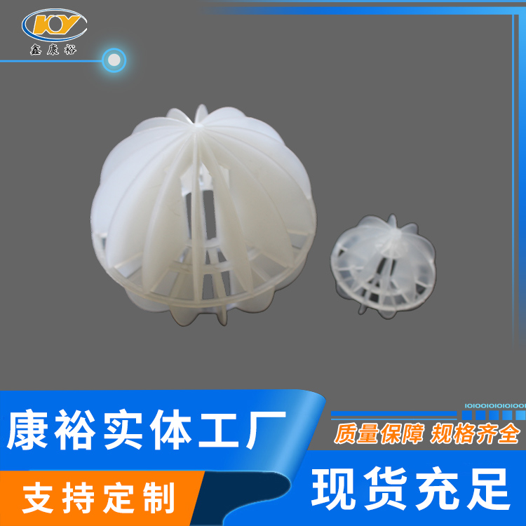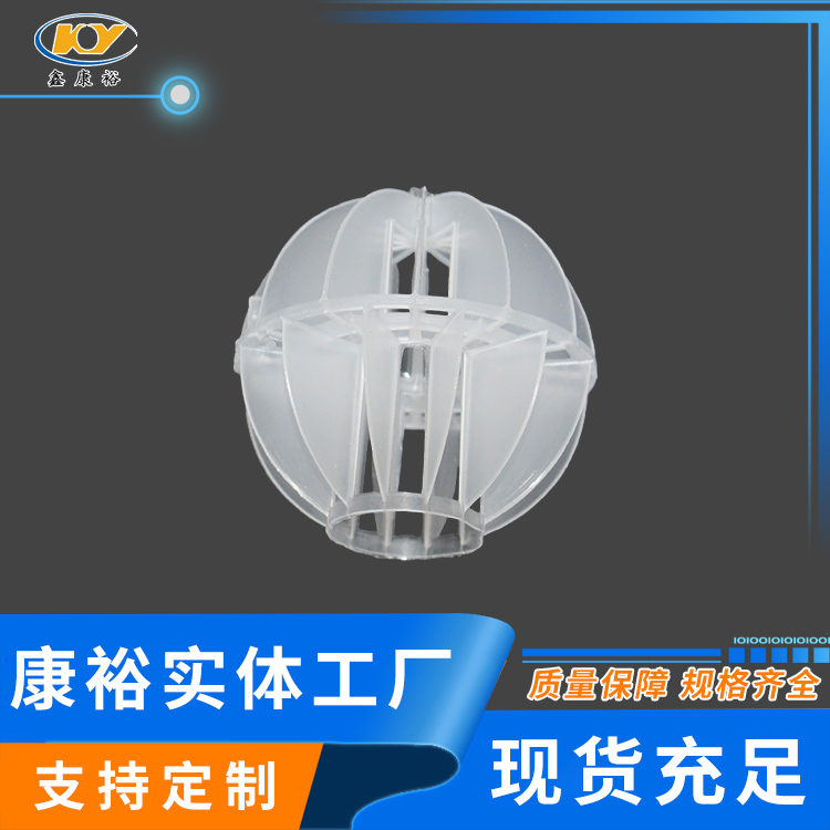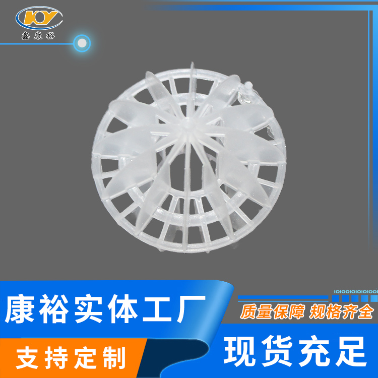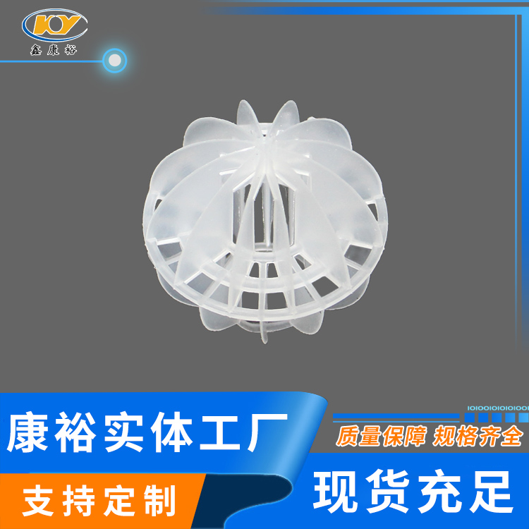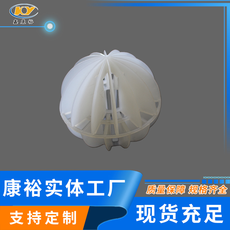 塑料多面空心球填料是水處理項(xiàng)目和廢氣處理常用到的一種填料,也是現(xiàn)在環(huán)保裝置項(xiàng)目常見(jiàn)的一種填料,大多采用聚丙烯(PP)塑料制成。多面空心球填料,在球中部沿整個(gè)周長(zhǎng)有一道加固環(huán),環(huán)的上下各有十二片球瓣,上下球瓣互相交錯(cuò),沿中心軸呈放射形布置。多面空心球填料具有表面積大,傳質(zhì)效率高,產(chǎn)品的球瓣與球瓣之間空間大,且重量輕、強(qiáng)度大、安裝方便、葉片多,阻力小,耐高溫,耐腐蝕,性能穩(wěn)定,適用于中間水箱,二氧化碳脫氧塔,接觸反應(yīng)塔等裝置。在全國(guó)電力、化學(xué)、化纖、電子、造紙、化肥生產(chǎn)、河水淡化,環(huán)保、三廢處理等行業(yè)的水處理、脫碳、脫氣、凈化、脫碳酸及油水分離等處理裝置中廣泛使用。