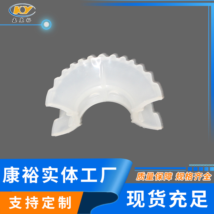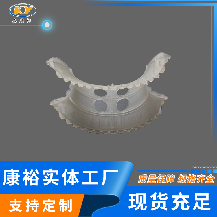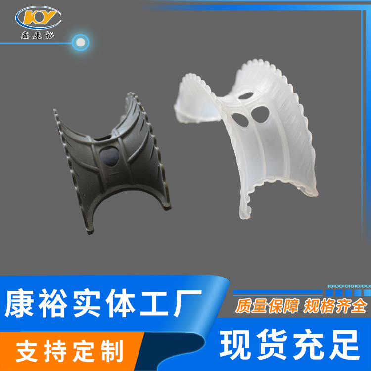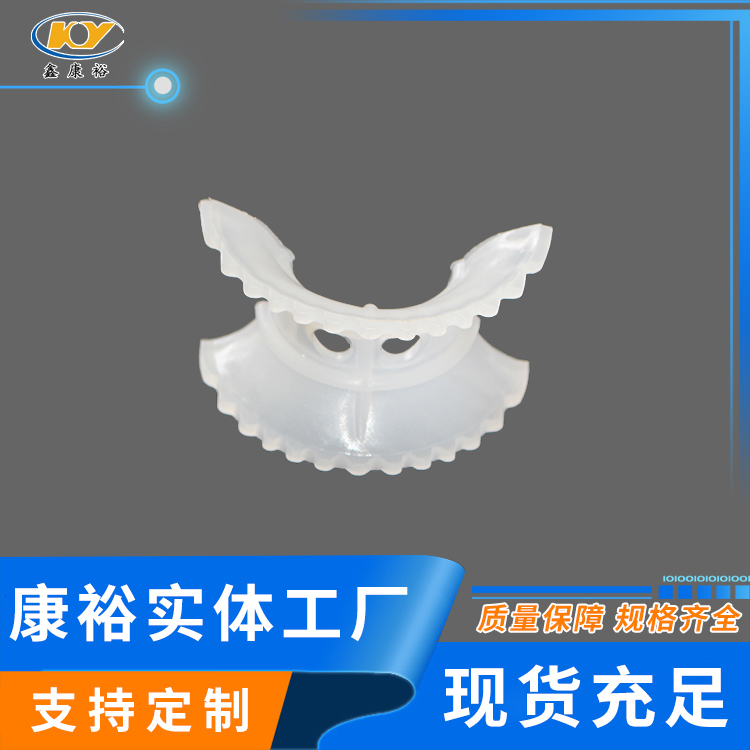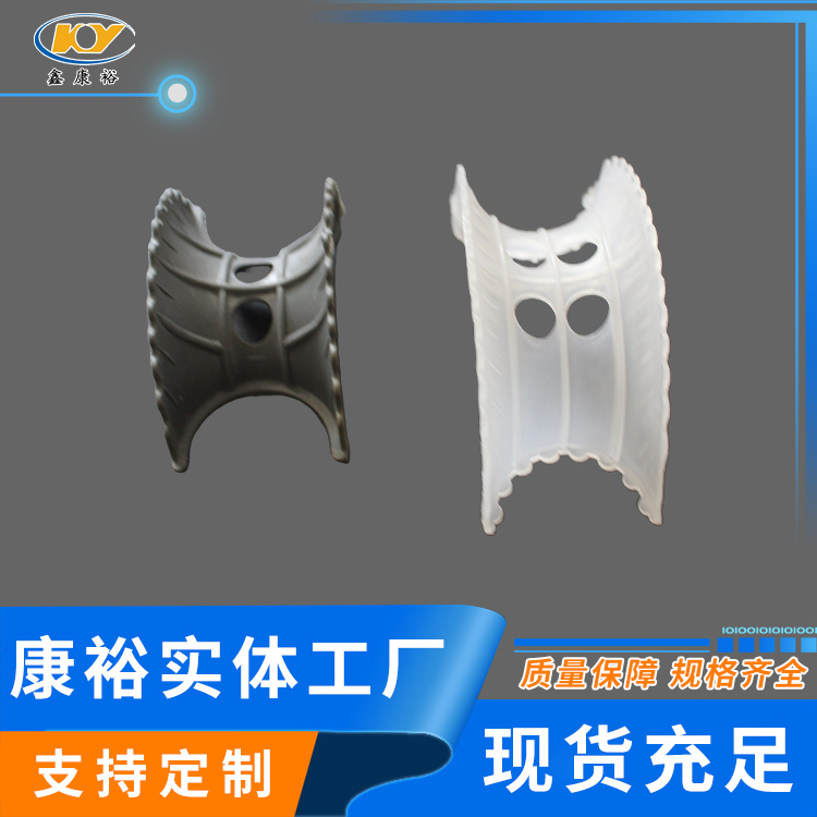 塑料異鞍環(huán)是20世紀70年代美國Noton公司對普通矩鞍環(huán)填料作出了改進,其特點是將扇形弧面改進成帶鋸齒邊緣的貝殼狀弧面,并在鞍背上增加了開孔,這樣填料層內的通道更加通暢,改善了液體分布性能,降低了氣體通過的阻力,提高了傳質性能。塑料異鞍環(huán)鞍形填料類似于馬鞍形狀,這種填料層中主要為弧形的液體通道,填料層內的空隙較環(huán)形填料(尤其較拉西環(huán)填料)更加連續(xù)。